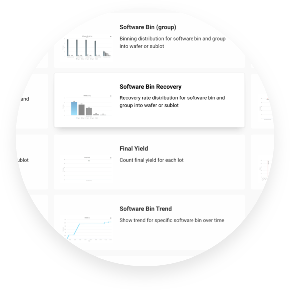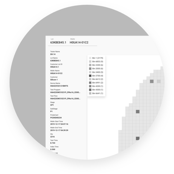 提供以 Yield / Bin / Parametric 不同面向的 wafer map, 用户能通过交互式接口依照不同需求, 堆栈特定的 wafer, 快速找出异常原因 , 并提供wafer by zone 分析方式, 计算不同区域中的良率及 Bin 分布, 进一步了解产品在不同阶段是否出现异常。