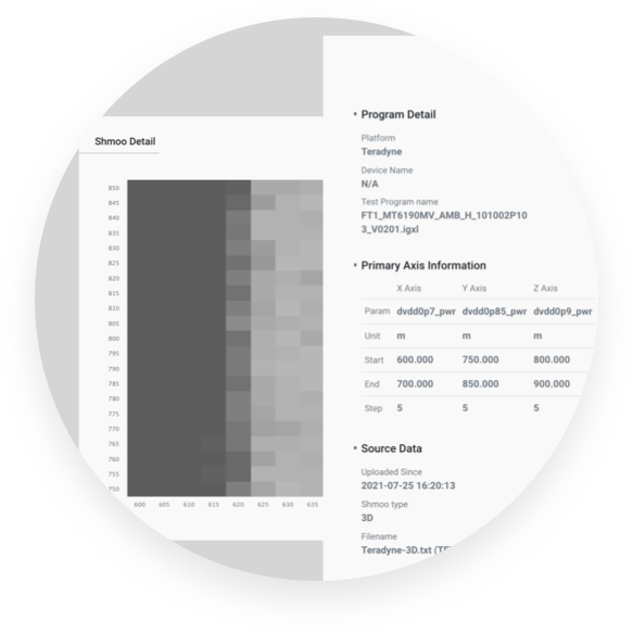 透过数据汇入,纪录及储存每个设备的 Shmoo 数据,提供用户分析及判读,并显示细节及图表以供进一步分析,减少人员误判的机率;交互式接口,也能弹性化客制各项相关报表,符合使用需求。
